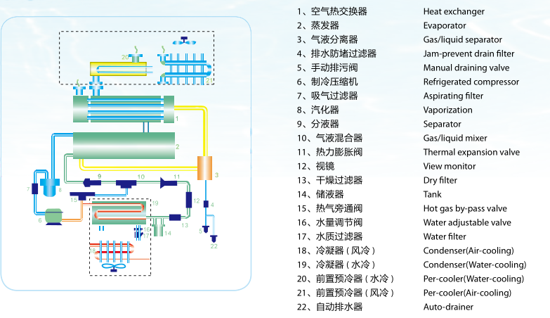 7優質的制冷配件:松下、谷輪、泰康、美優樂的壓縮機,丹佛斯膨脹閥,鷺宮電磁閥,都是國內外優質制冷配件供應商,為機器的安全 運行奠定了基礎。