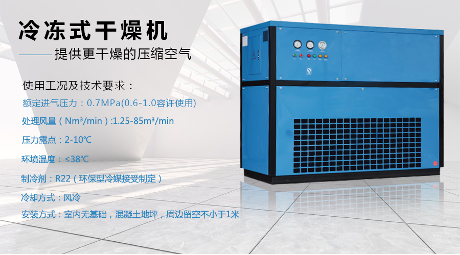 滿足您的多樣需求冷凍式干燥器分為風冷標準型(低、高溫型)、水冷標準型(低、高溫型)、 特殊型(高溫、高壓、低壓、深冷、防爆等)處理量從 1.7m 3 /min 到 500m 3 /min;壓力露點 2-10℃;控制方式有儀表、電子、PLC 等多種。電 源 220V/1ph/50Hz 、380V/3ph/50Hz、110V/1ph/60Hz、440V/3ph/50Hz, 空氣系統有不銹鋼外筒體、鋁外筒體,還可以生產深冷干機、冷水機、 冷卻器等,可為您定制各種特殊要求的產品。