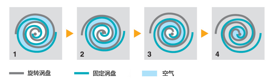 | 壓縮原理 | 兩個圓漸開線型線的動靜渦 盤相互嚙合而完成吸氣、壓 縮和排氣的工作過程 | 螺桿空壓機是容積式壓縮機的 一種;靠陰陽轉子的齒槽容積 變化而實現吸氣、壓縮、排氣 三個工作過程 | 活塞空壓機是往復式空壓機 的一種;靠電動機帶動曲柄 滑塊機構形成的活塞往復運 動,而實現吸氣、壓縮、排 氣三個工作過程 |